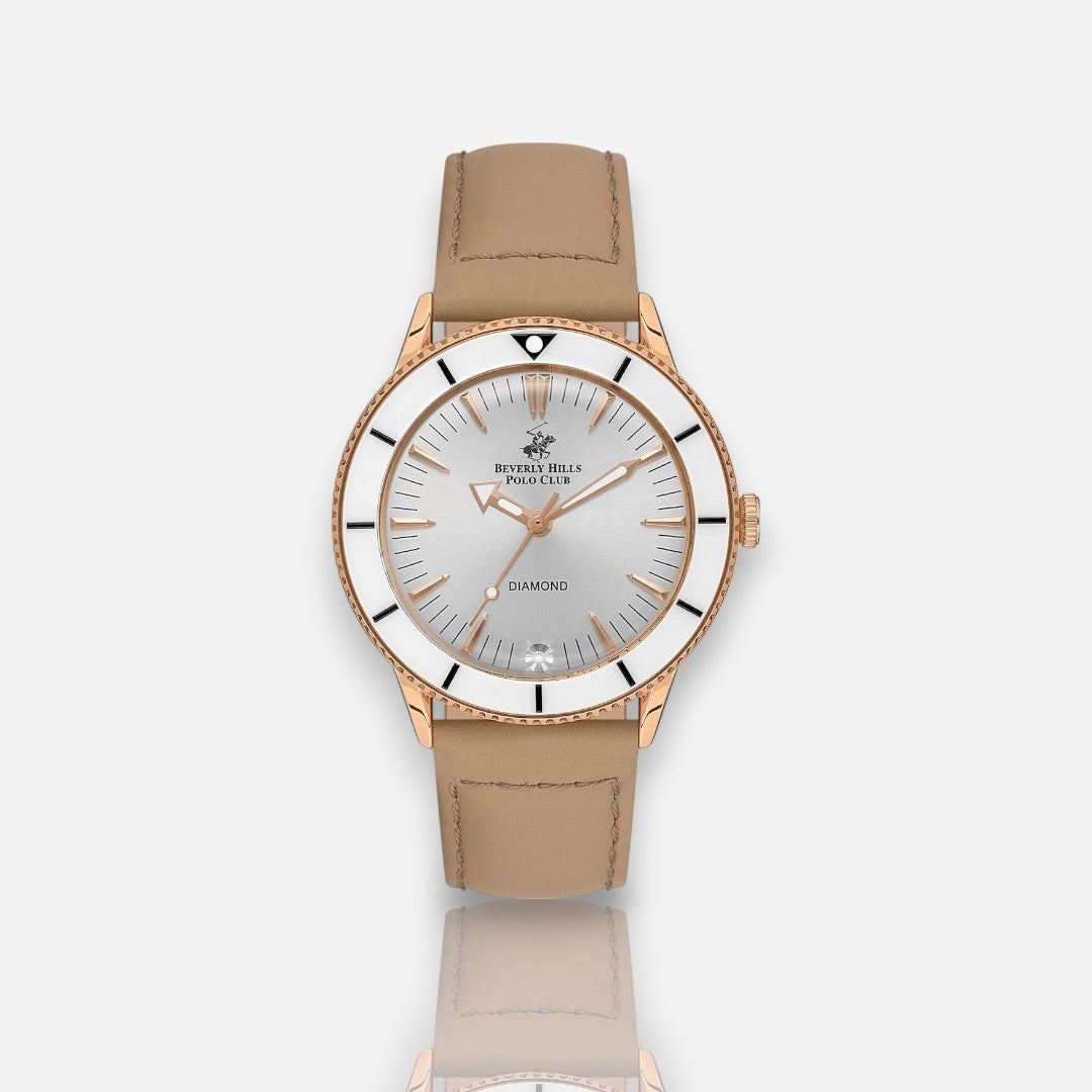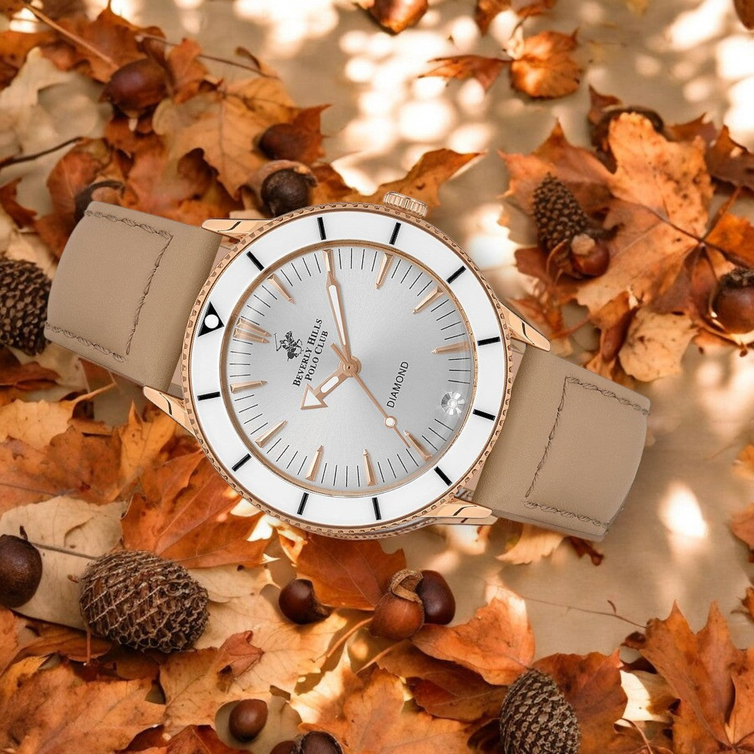 שיק סתווי עם טאצ' אלגנטי בהשראת מורשת המועדון האקסקלוסיבי של פולו. עם גוף רוז גולד מוברש ומסגרת קרמיקה לבנה השעון הזה הוא תכשיט יוצא דופן. 💖 אבל מה שבאמת הופך אותו למיוחד הוא הלוח המשובץ יהלום בשעה 6 שיוצר מראה קלאסי עם טוויסט. 💚