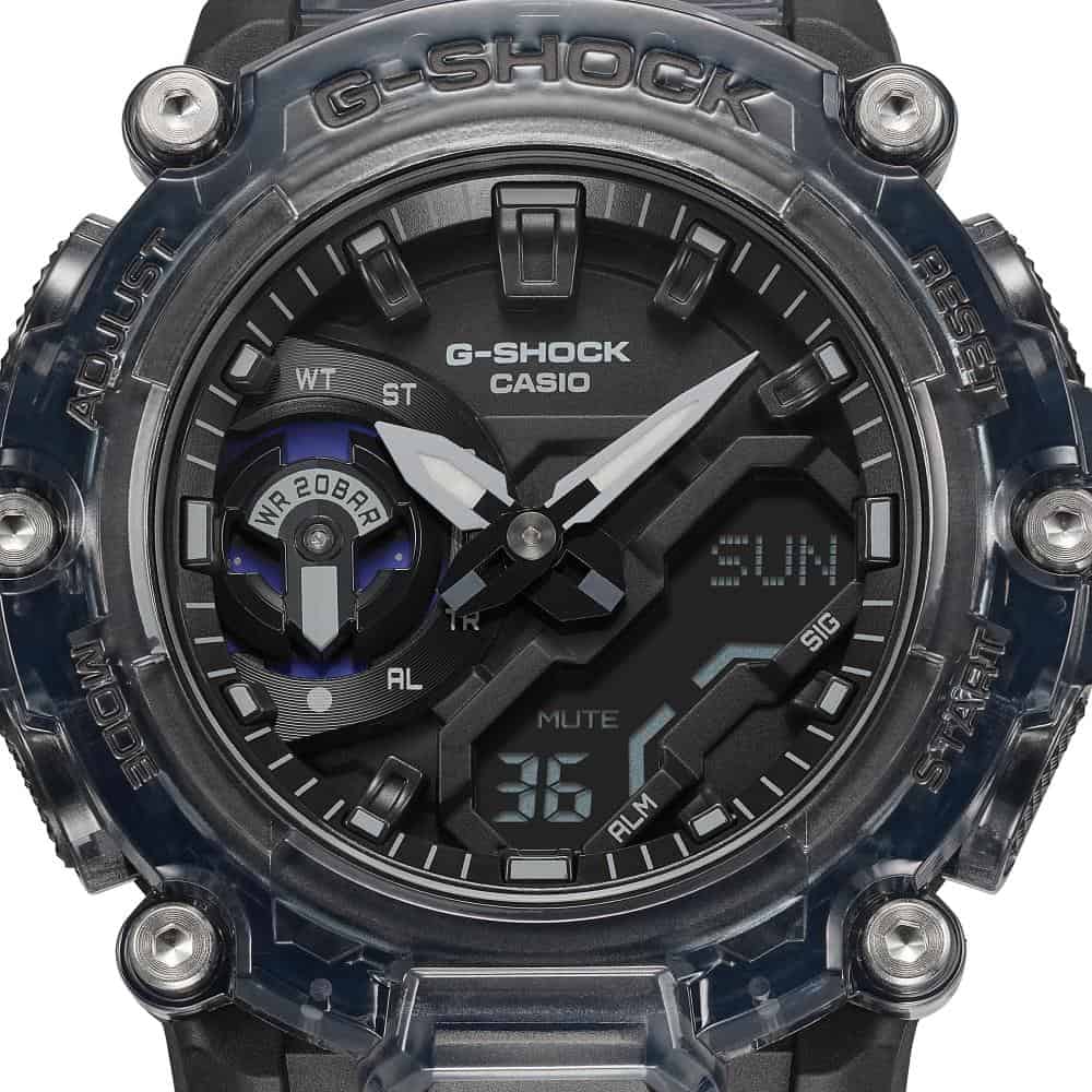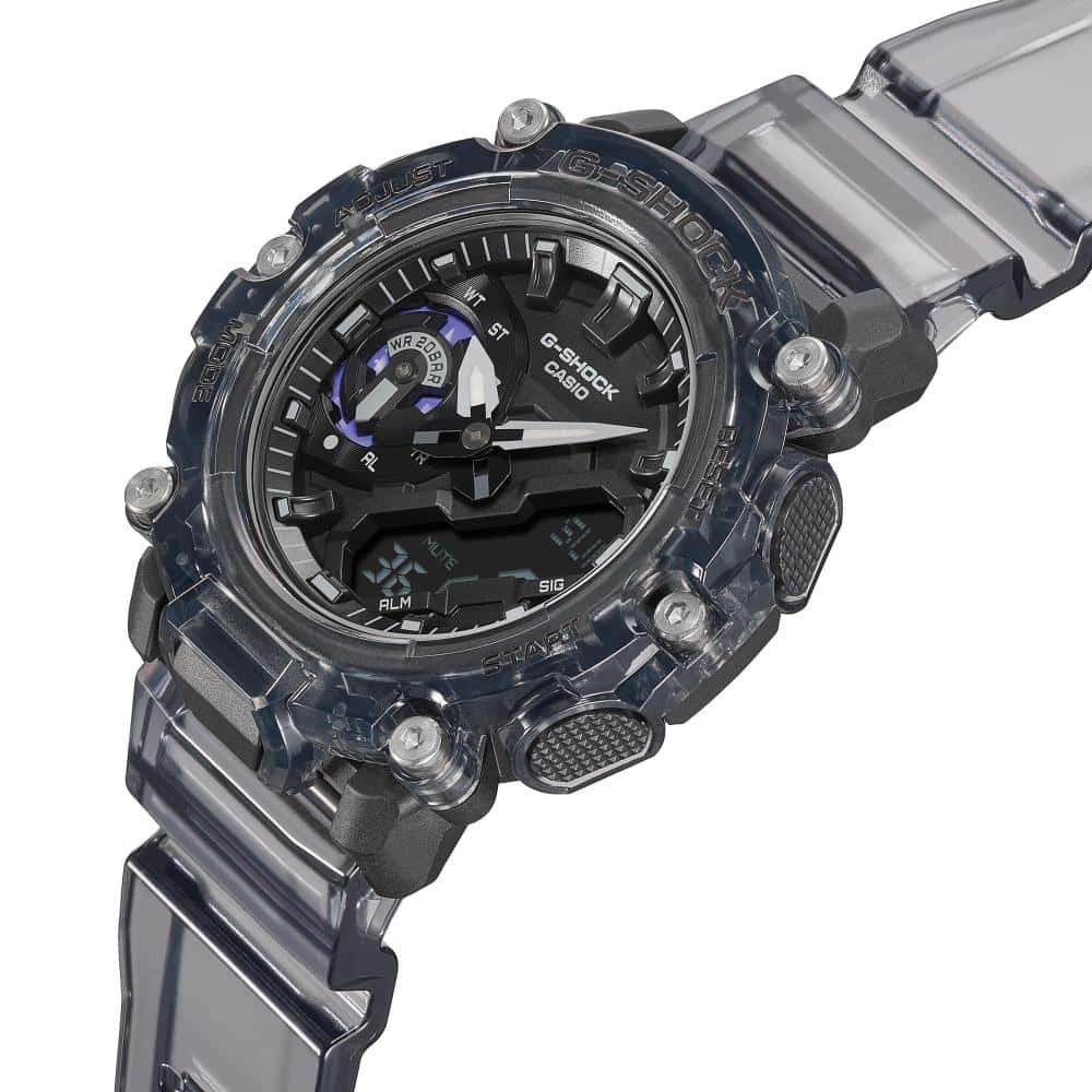 גוף השעון והרצועה עשויים שרף קל משקל ועמיד בפני זעזועים, בגימור אפור-שקוף למחצה המעניק לו מראה ייחודי ו"קרחוני". ה-GA-2200 כולל את מבנה ה-Carbon Core Guard, המשלב שרף מחוזק בסיבי פחמן, המספק חוזק ועמידות יוצאי דופן בפני פגיעות מבלי להוסיף משקל מיותר. לוח המחוגים הרב-שכבתי והעמוק כולל מחוגים אנלוגיים וצג דיגיטלי נסתר, עם אינדקסים בולטים בגוון אפור-שחור היוצרים מראה דרמטי וקריא. הכפתורים הגדולים והברורים מקלים על התפעול גם בתנאי שטח.