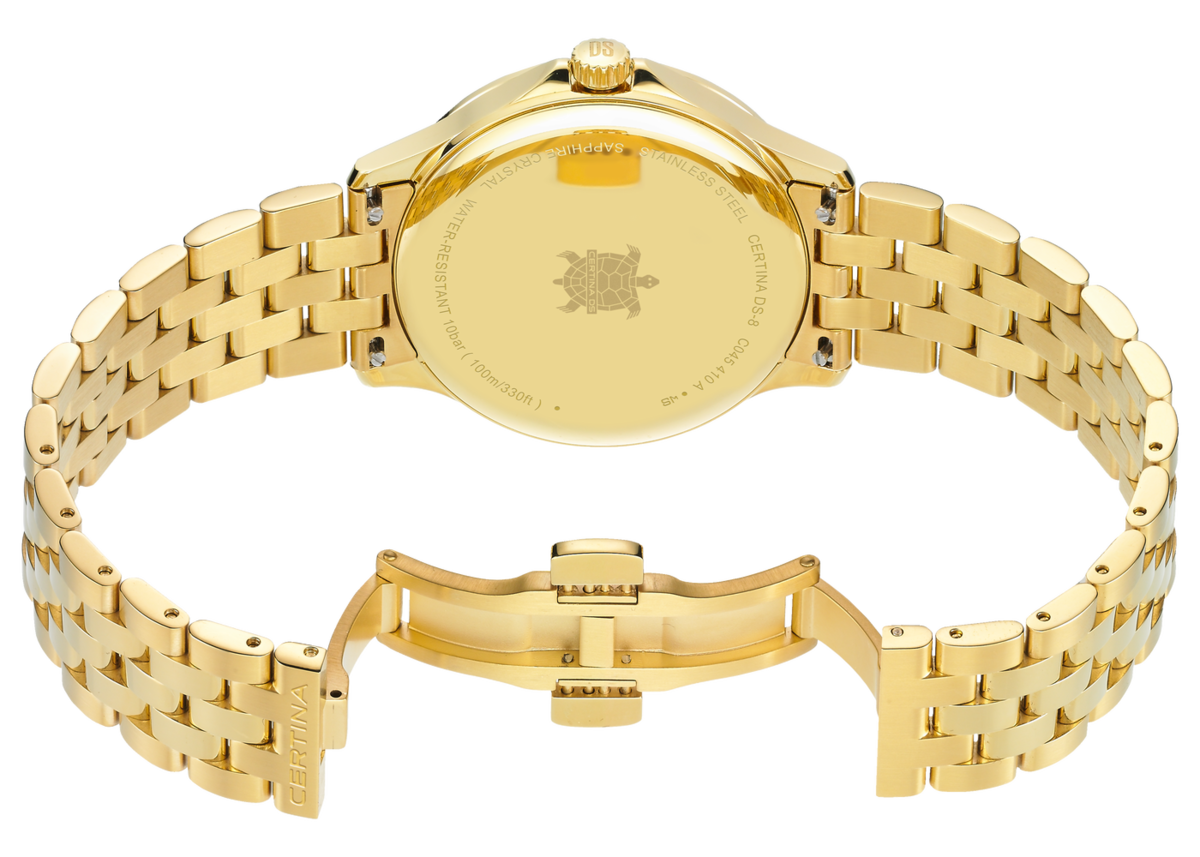 השעון השוויצרי הזה הוא שילוב מושלם בין אלגנטיות נצחית לדיוק ושלמות שמאפיינים את השענות השוויצרית המעולה של סרטינה. עם גוף בציפוי זהב עדין ורצועת מתכת תואמת,  השעון הזה הוא תכשיט אלגנטי גברי. 💖  שילוב הגימורים ברצועה -  הברקה  עדינה  ומאט  מעניין  שיוצרים  מראה  יוקרתי  ומתוחכם. ✨  הלוח  הזהוב  הבהיר  עם  האינדקסים  העדינים  משלים  את  המראה  האלגנטי.