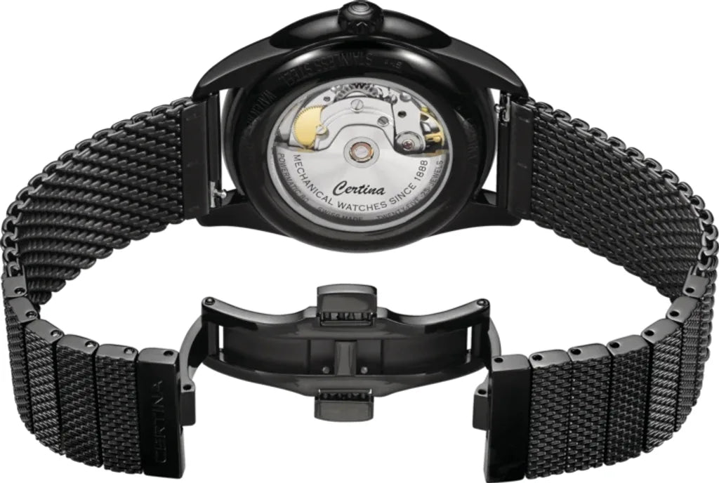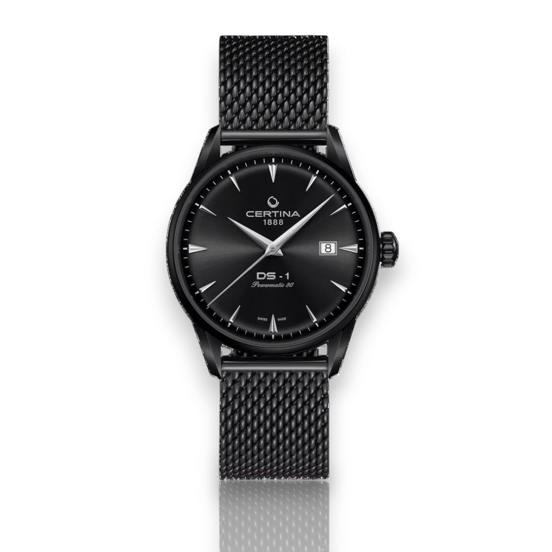 עון זה מבית סרטינה בגוון שחור עמוק, מציג שילוב הרמוני של אלגנטיות מודרנית ופונקציונליות מדויקת. מנגנון אוטומטי איכותי מבית ETA פועם מתחת ללוח השעון השחור, בעל טקסטורה מעודנת, המשרה תחושת עומק ותחכום מאופק. מחוגים וסמנים כהים וחדים יוצרים ניגוד עדין, ורצועת המתכת השחורה בסגנון מילאנז משלימה את המראה המוקפד והמובחן.
