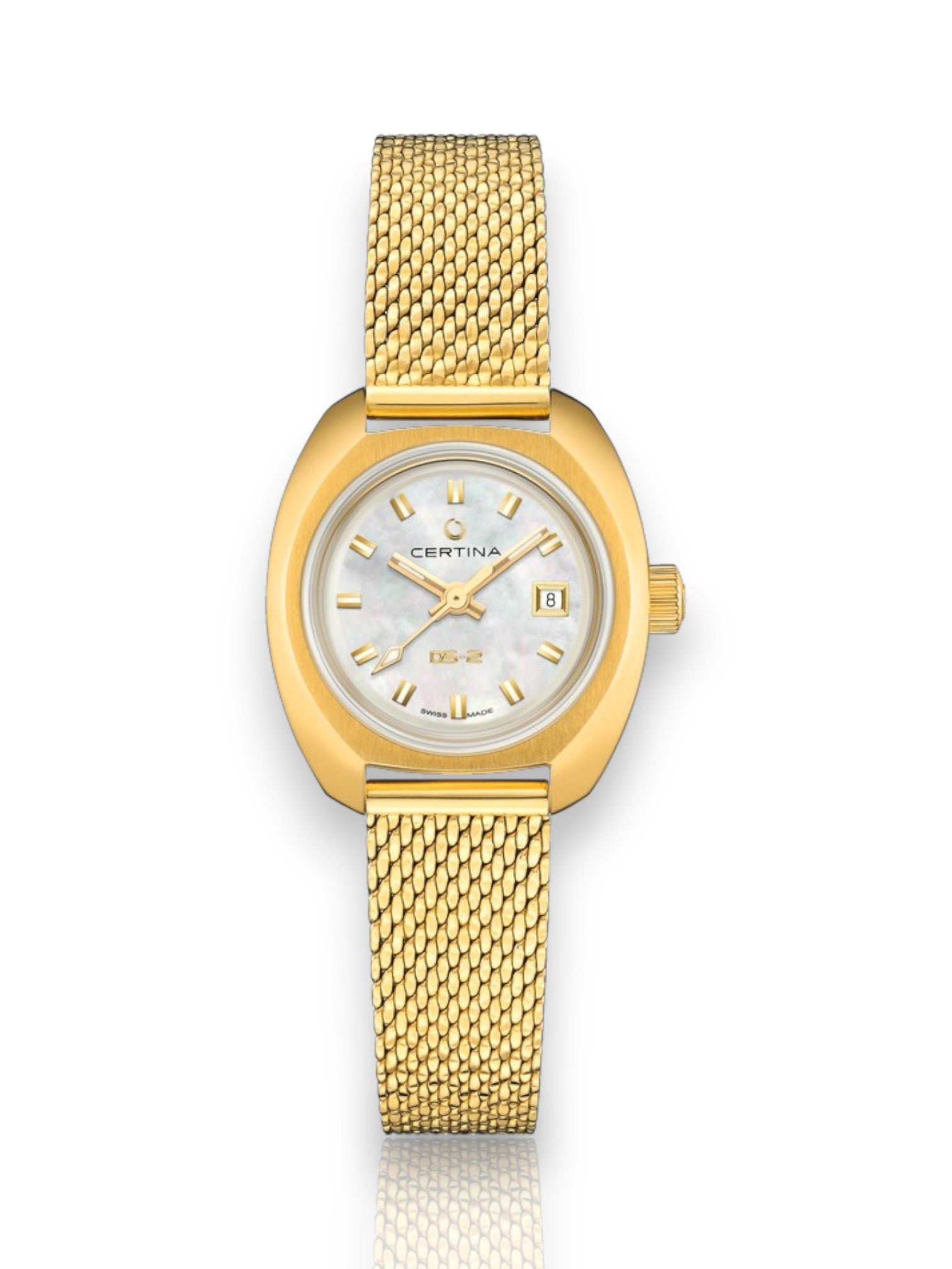 גוף השעון הייחודי, בעל צורה אובלית-מרובעת (או "כרית"), עשוי פלדת אל-חלד בגימור זהב מלוטש, המעניק לו מראה עשיר וזוהר. לוח המחוגים עשוי פנינה טבעית (Mother of Pearl) לבנה, המעניקה לו ברק עדין וגוונים משתנים בהתאם לאור, ומוסיפה נופך של יוקרה וקסם. סימני השעות מוחלפים באינדקסים מוזהבים בולטים, המעניקים קריאות נוחה ומשלימים את המראה המאופק והאלגנטי. חלון התאריך ממוקם בנוחות בשעה 3. הלוגו של "CERTINA" ממוקם מתחת לשעה 12, ומתחתיו הכיתוב "DS-2", המציין את הדגם ואת מערכת ה-DS (Double Security) הייחודית של Certina, המבטיחה עמידות משופרת בפני זעזועים. הכיתוב "SWISS MADE" בחלק התחתון מדגיש את מקוריותו ואיכותו השוויצרית.