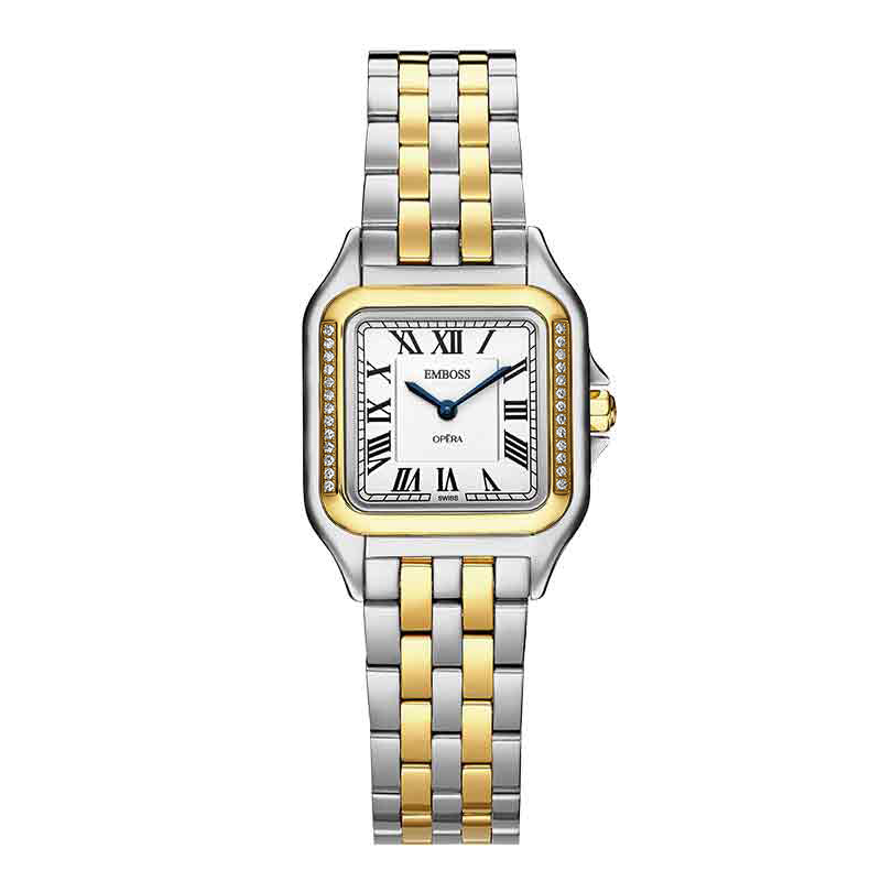 אבל מה שבאמת גורם לו לבלוט הוא העיצוב המרובע הייחודי שלו (34*34 מ"מ) עם שיבוץ יהלומים ולוח בהיר מעוטר בספרות רומיות קלאסיות. 🕰️ השילוב המושלם בין מודרניות למסורת!