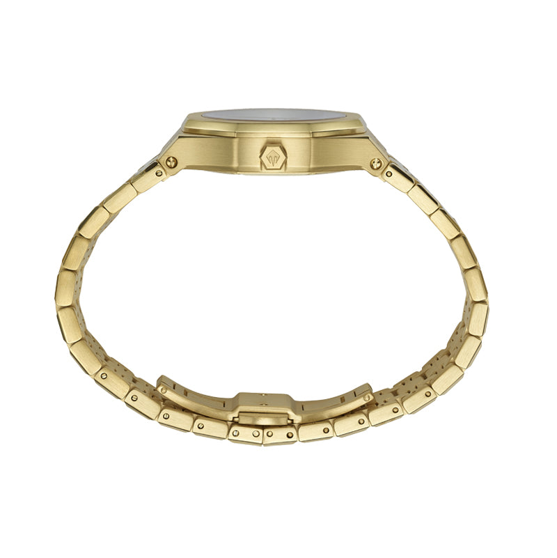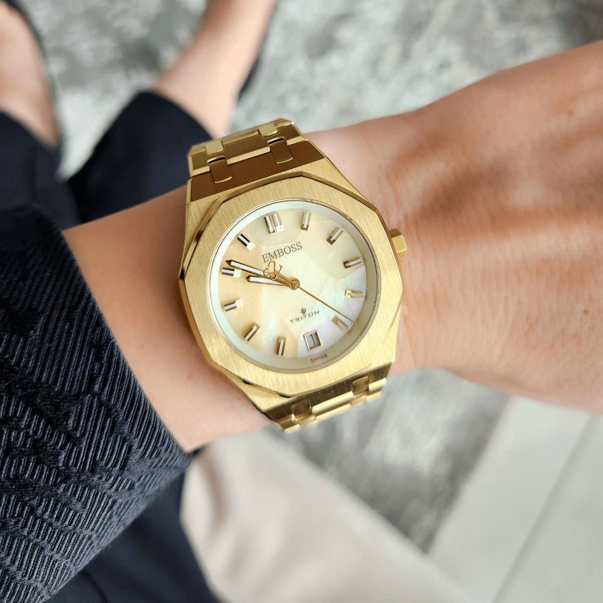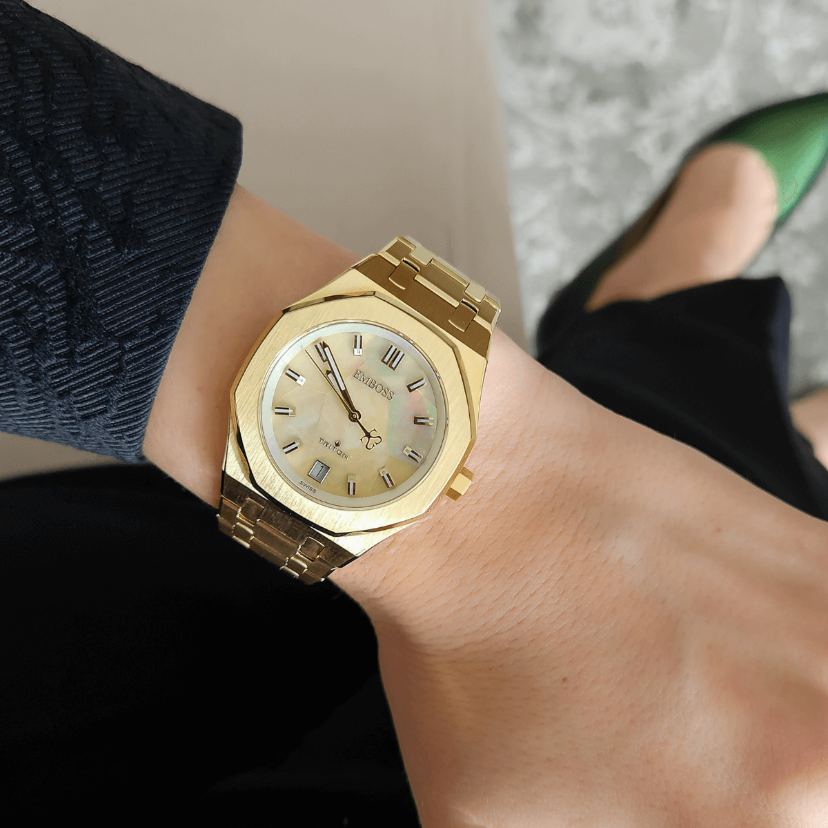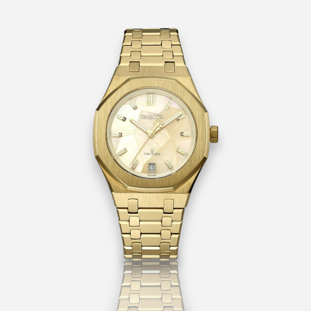 עם גוף מתומן מוזהב בגימור מאט ורצועת פלדה תואמת, השעון הזה מבית EMBOSS הוא תכשיט מובלט. 💖 לוח השעון הייחודי שלו - שילוב מרהיב היוצר אפקט מוזאיקה מרשים. 🤩