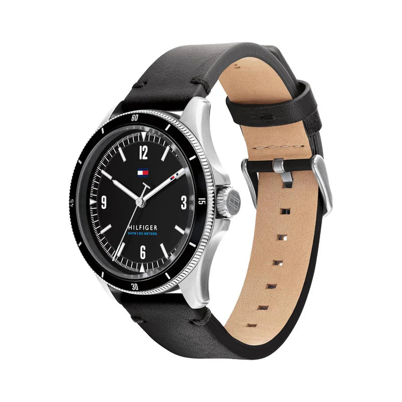 גוף השעון העגול והדק יחסית עשוי פלדת אל-חלד כסופה מלוטשת, המעניקה לו מראה קלאסי ויוקרתי. לוח המחוגים השחור והנקי כולל ספרות ערביות גדולות ובולטות (ב-3, 6, 9 ו-12), יחד עם אינדקסים דקים בצבע לבן, המבטיחים קריאות נוחה. מחוגי השעות והדקות הכסופים, עם קצה מואר בחומר זרחני, משלימים את המראה המאופק והאלגנטי. דגל ה-Tommy Hilfiger המפורסם ממוקם מתחת לשעה 12, ומוסיף טאץ' אייקוני ומוכר. מסגרת (בזל) כסופה עם סימוני דקות משלימה את המראה הספורטיבי.