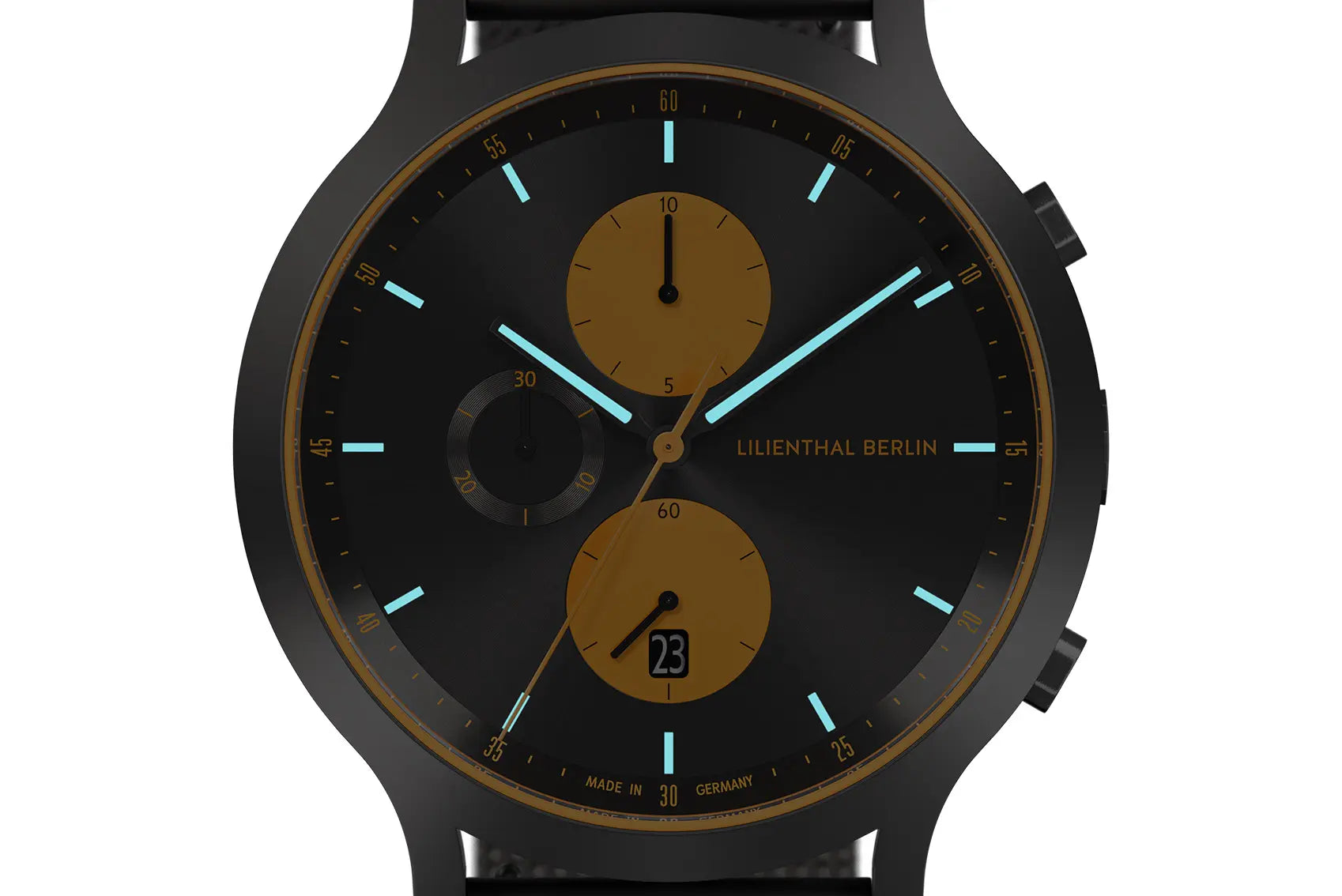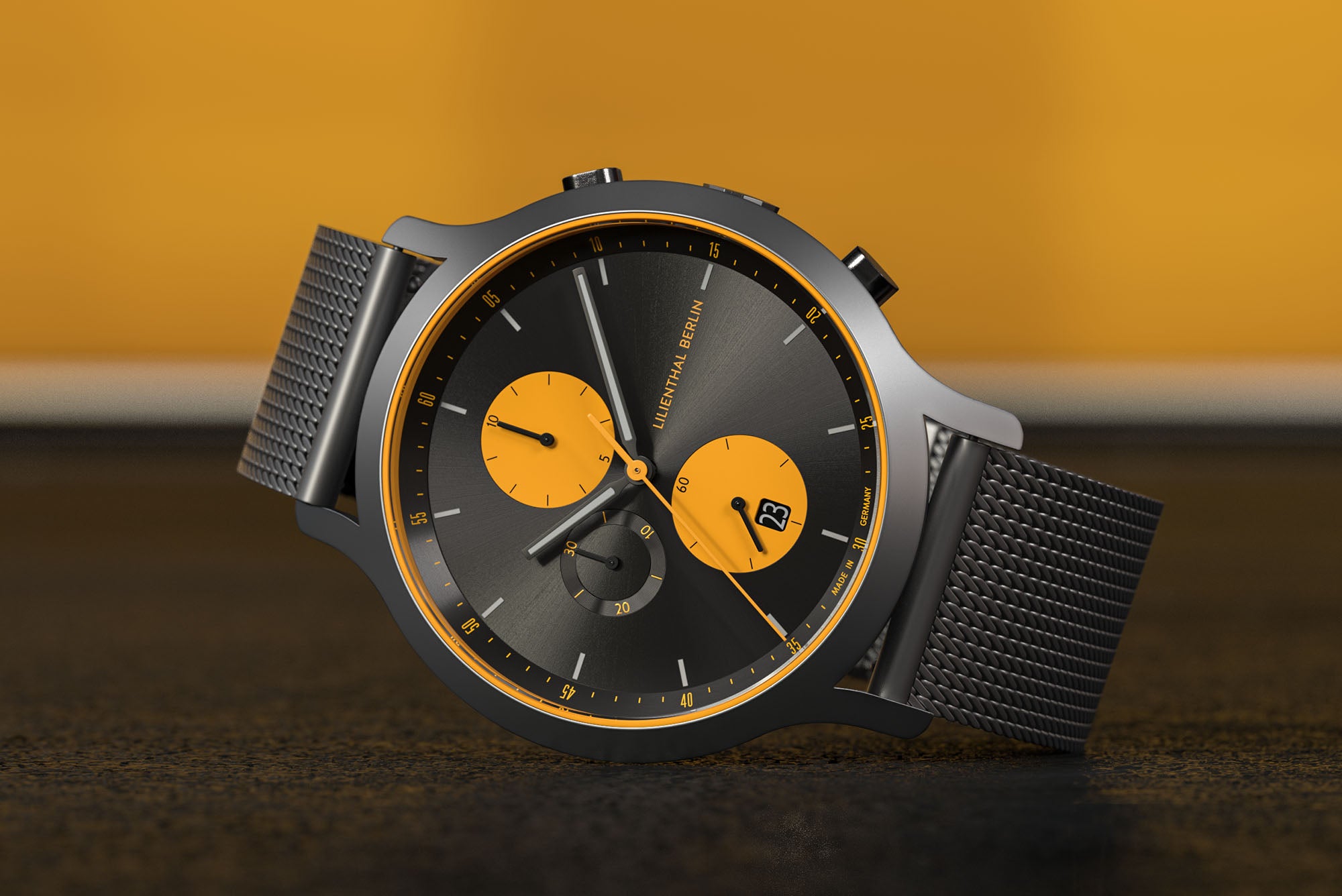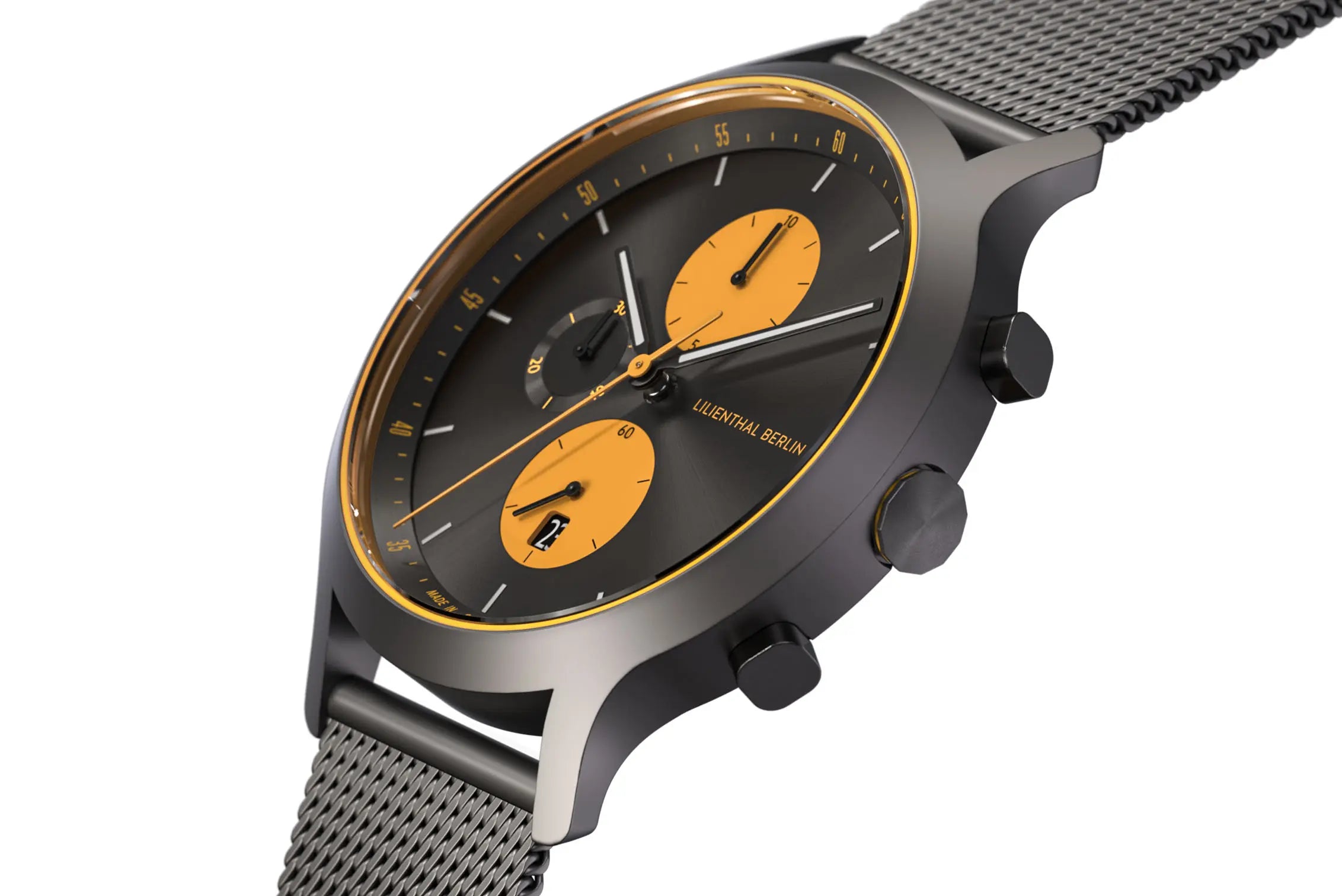 מותג השעונים הגרמני החדשני Lilienthal Berlin שזכה להכרה ולפרסים בינלאומיים בזכות עיצוביו הייחודיים והמרעננים, מציג את הכרונוגרף Line 1 מחווה אמיתית למערכת רכבות התחתית שהיא חלק בלתי נפרד מהחיים בברלין. גוף השעון העשוי פלדת אל-חלד בגימור אנתרציט מט עוטף לוח מחוגים בגוון אפור כהה עם שני לוחות המשנה הכתומים של הכרונוגרף המשולבים בצורה הרמונית בלוח השעון ומאפשרים מדידת זמנים מדויקת. רצועת מילאנס אפורה כהה וגמישה משלימה את המראה האורבני והמודרני של השעון ומבטיחה נוחות ענידה מרבית.