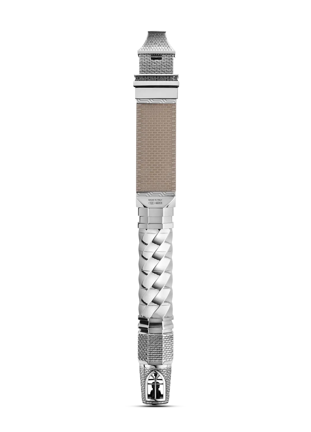 מלאכת יד עילית וטכנולוגיה מתקדמת הקליפס מכסף סטרלינג מעובד בכרסום מדויק ברמת דיוק גבוהה במיוחד ומושלם בעבודת יד. פרופיל הצד המחורץ יוצר מיקרו־טקסטורה פונקציונלית, ובמקביל מעניק ניגוד חומרי מעודן אל מול המשטחים המלוטשים של הכיפה ושיבוץ הפאווה של ספירים, טופזים ויהלומים.