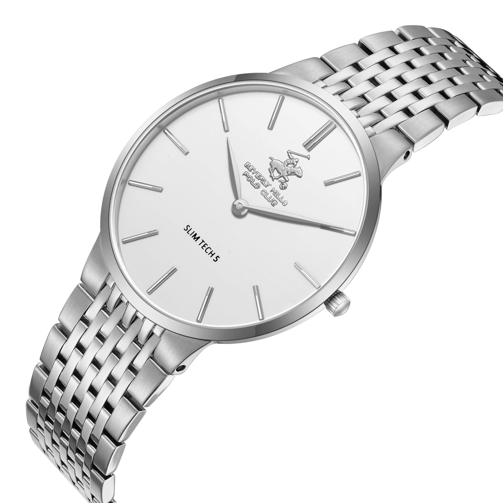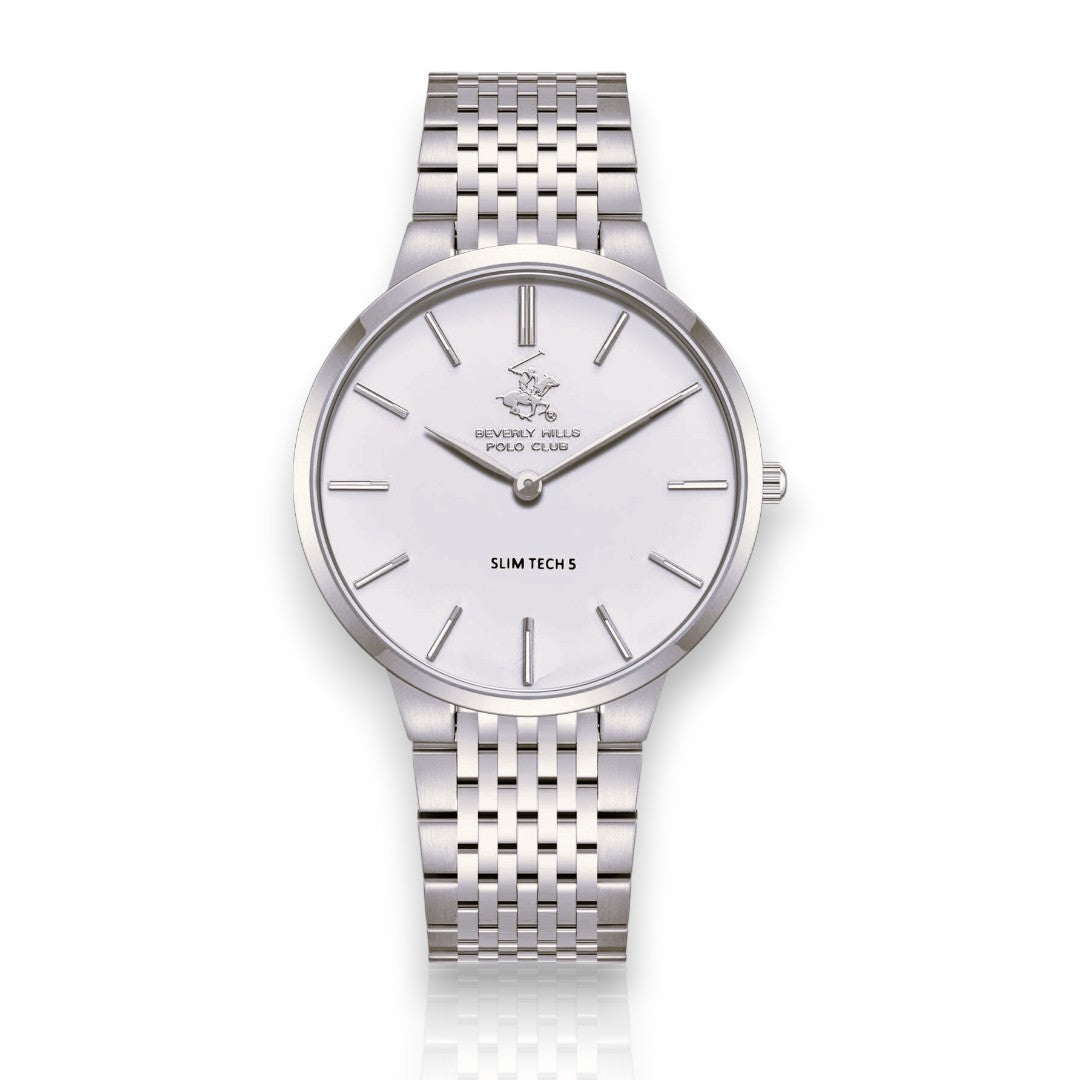 גוף השעון העגול והדק במיוחד עשוי פלדת אל-חלד כסופה מלוטשת, המעניקה לו מראה אלגנטי ומינימליסטי. לוח המחוגים השחור והנקי כולל אינדקסים דקים וארוכים בצבע כסוף, יחד עם מחוגים תואמים, המדגישים את העיצוב הנקי והקריא. הלוגו של Beverly Hills Polo Club ממוקם בחלק העליון של הלוח, והכיתוב "SLIM TECH 5" בחלק התחתון, המעיד על הפרופיל הדק של השעון.