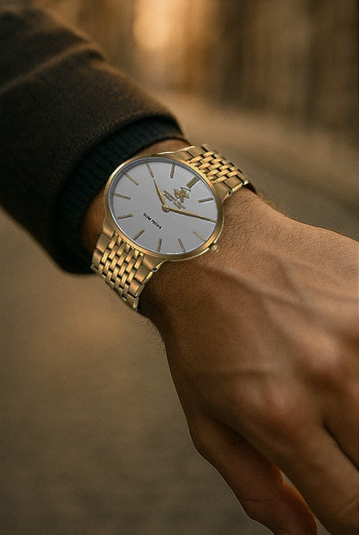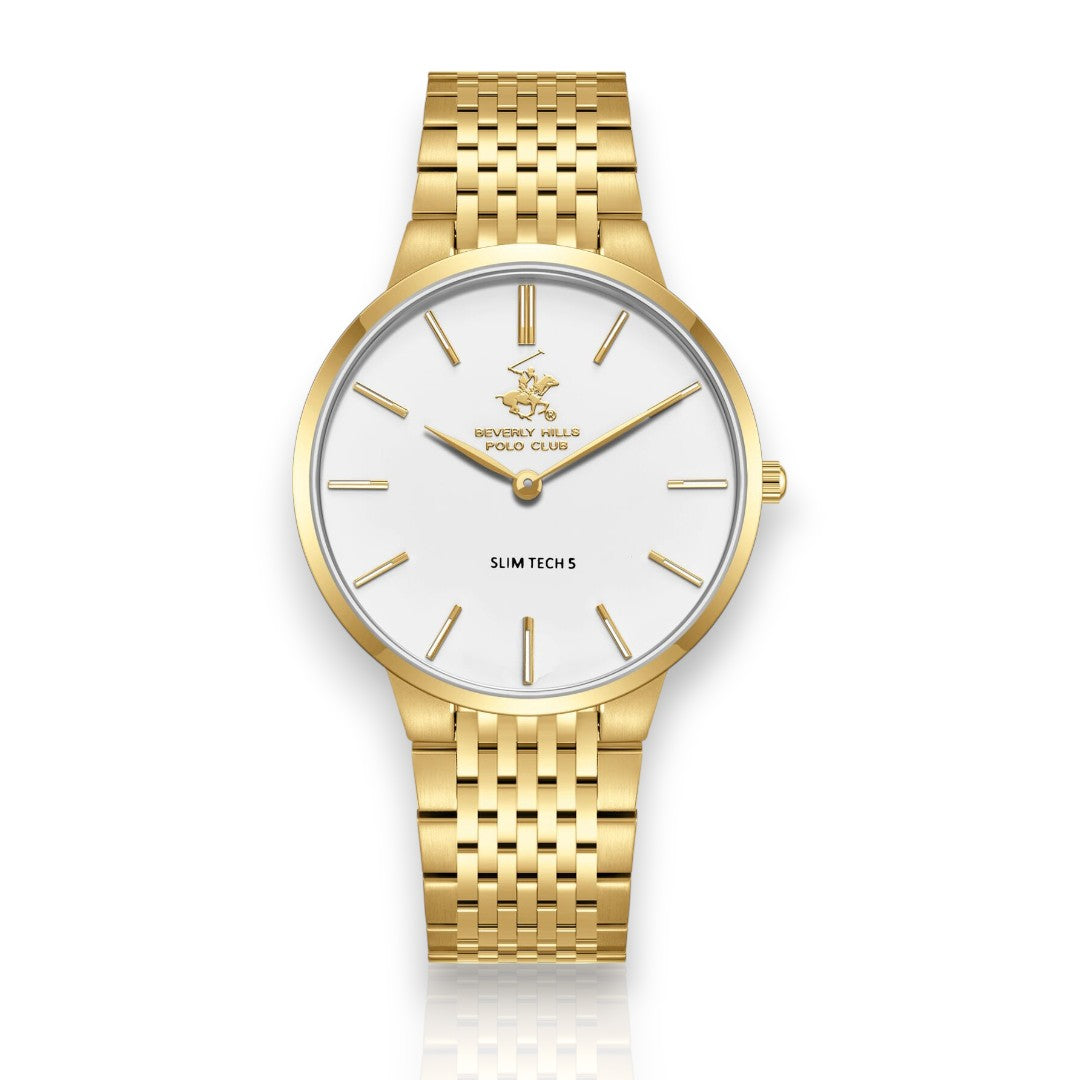 גוף השעון העגול והדק במיוחד עשוי פלדת אל-חלד מוזהבת מלוטשת, המעניקה לו מראה אלגנטי ומינימליסטי. לוח המחוגים הבהיר והנקי כולל אינדקסים דקים וארוכים בצבע מוזהב, יחד עם מחוגים תואמים, המדגישים את העיצוב הנקי והקריא. הלוגו של Beverly Hills Polo Club ממוקם בחלק העליון של הלוח, והכיתוב "SLIM TECH 5" בחלק התחתון, המעיד על הפרופיל הדק של השעון.