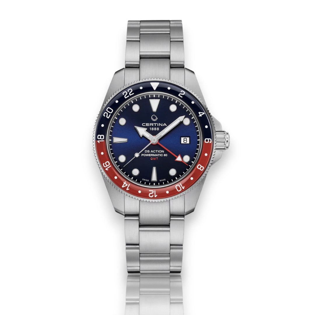 שעון סרטינה DS Action GMT Powermatic 80 משלב בין עיצוב ספורטיבי אלגנטי לפונקציונליות ייחודית. לוח השעון השחור, עם סמני השעות והמחוגים הבולטים, מבטיח קריאות ברורה בכל תנאי. בזל הכחול-אדום, המושך את העין, מסמן חלוקה של 24 שעות ומאפשר עקיבה אחר שני אזורי זמן, תוך הוספת נגיעה של דרמה וסגנון. רצועת המתכת האלגנטית משלימה את המראה המוקפד והמובחן.