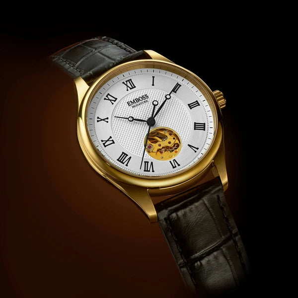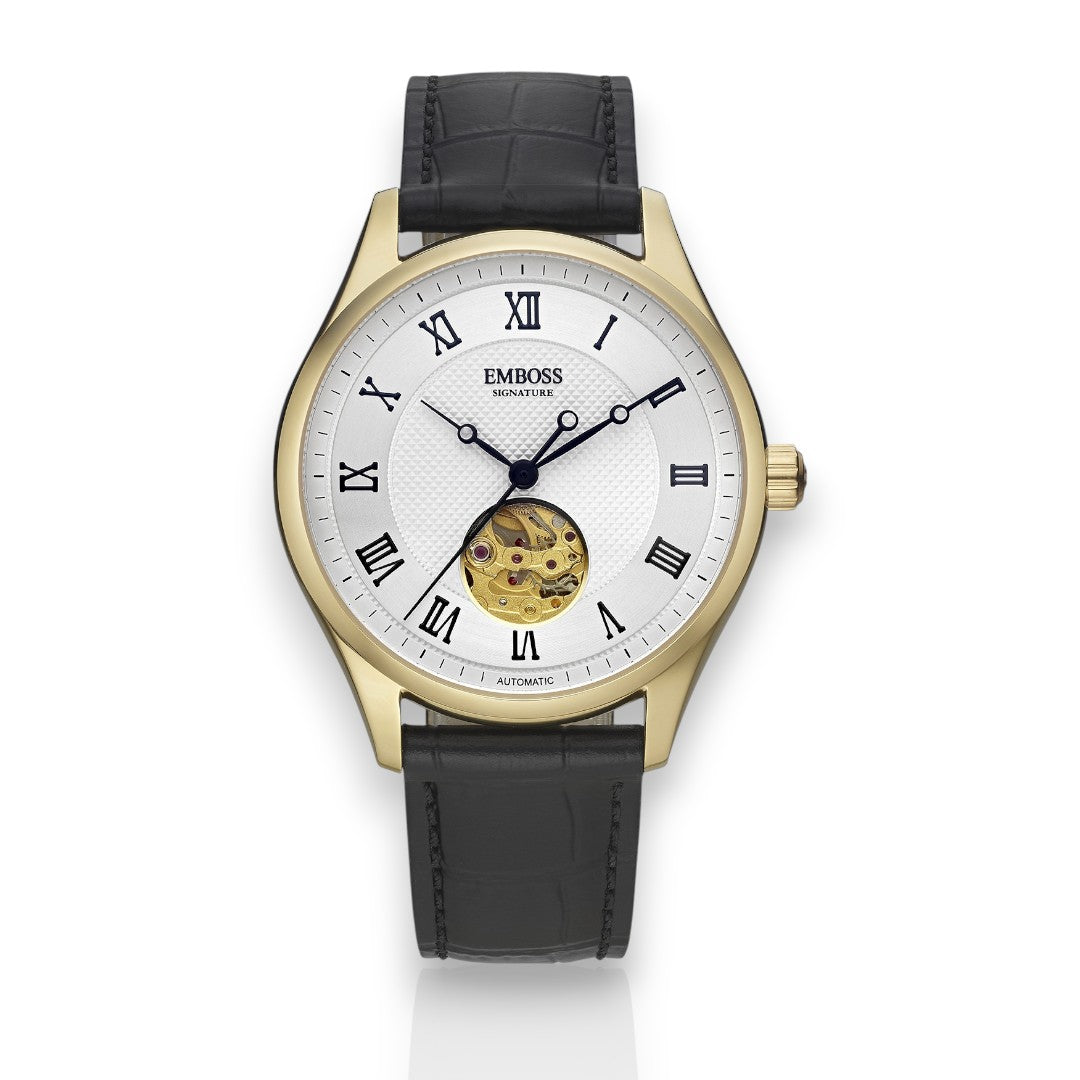 שעון זה מסדרת EMBOSS Signature מגלם את התמצית של אלגנטיות גברית ונוכחות מרשימה – שילוב הרמוני בין עיצוב קלאסי לאומנות השעון המודרנית.