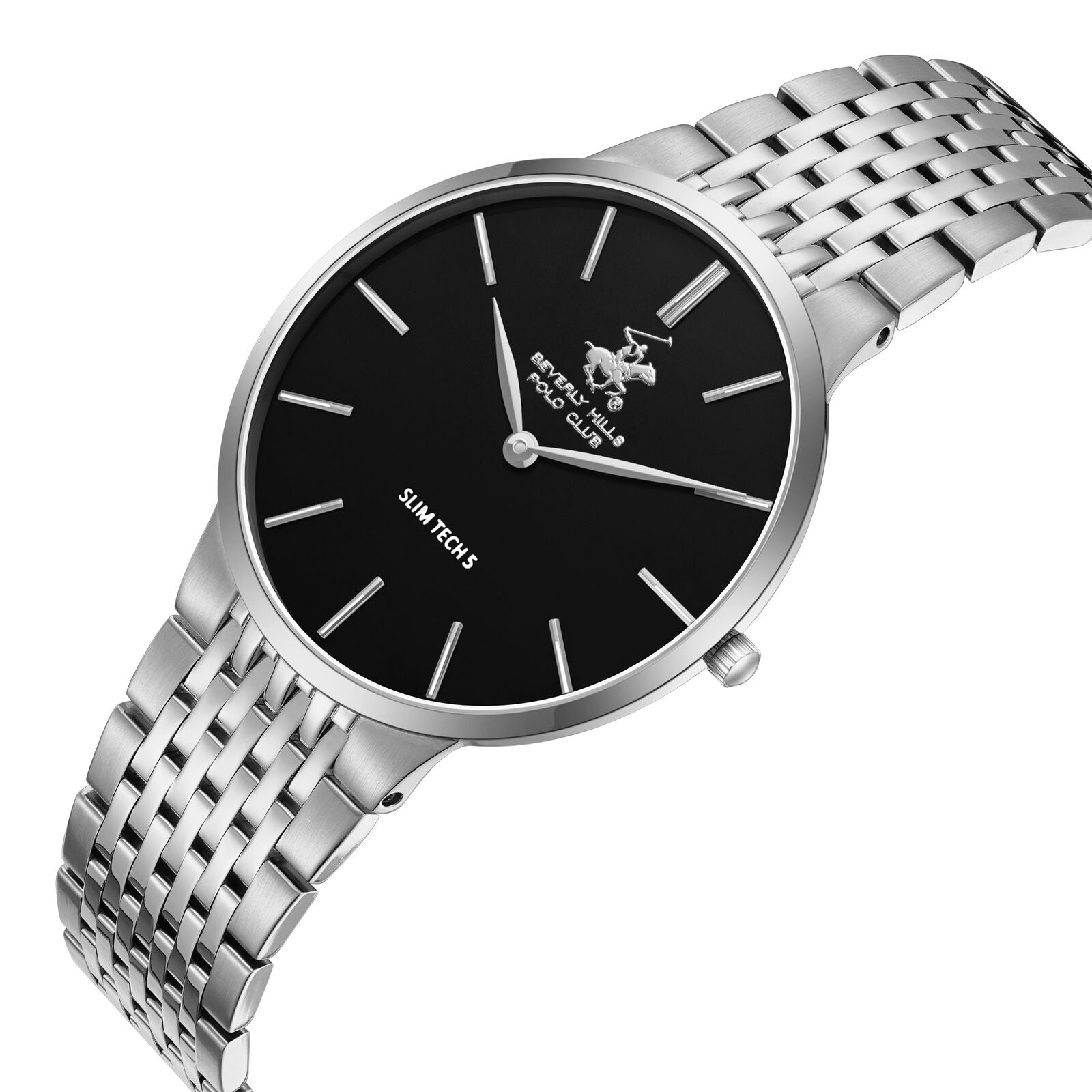 גוף השעון העגול והדק במיוחד עשוי פלדת אל-חלד כסופה מלוטשת, המעניקה לו מראה אלגנטי ומינימליסטי. לוח המחוגים השחור והנקי כולל אינדקסים דקים וארוכים בצבע כסוף, יחד עם מחוגים תואמים, המדגישים את העיצוב הנקי והקריא. הלוגו של Beverly Hills Polo Club ממוקם בחלק העליון של הלוח, והכיתוב "SLIM TECH 5" בחלק התחתון, המעיד על הפרופיל הדק של השעון.