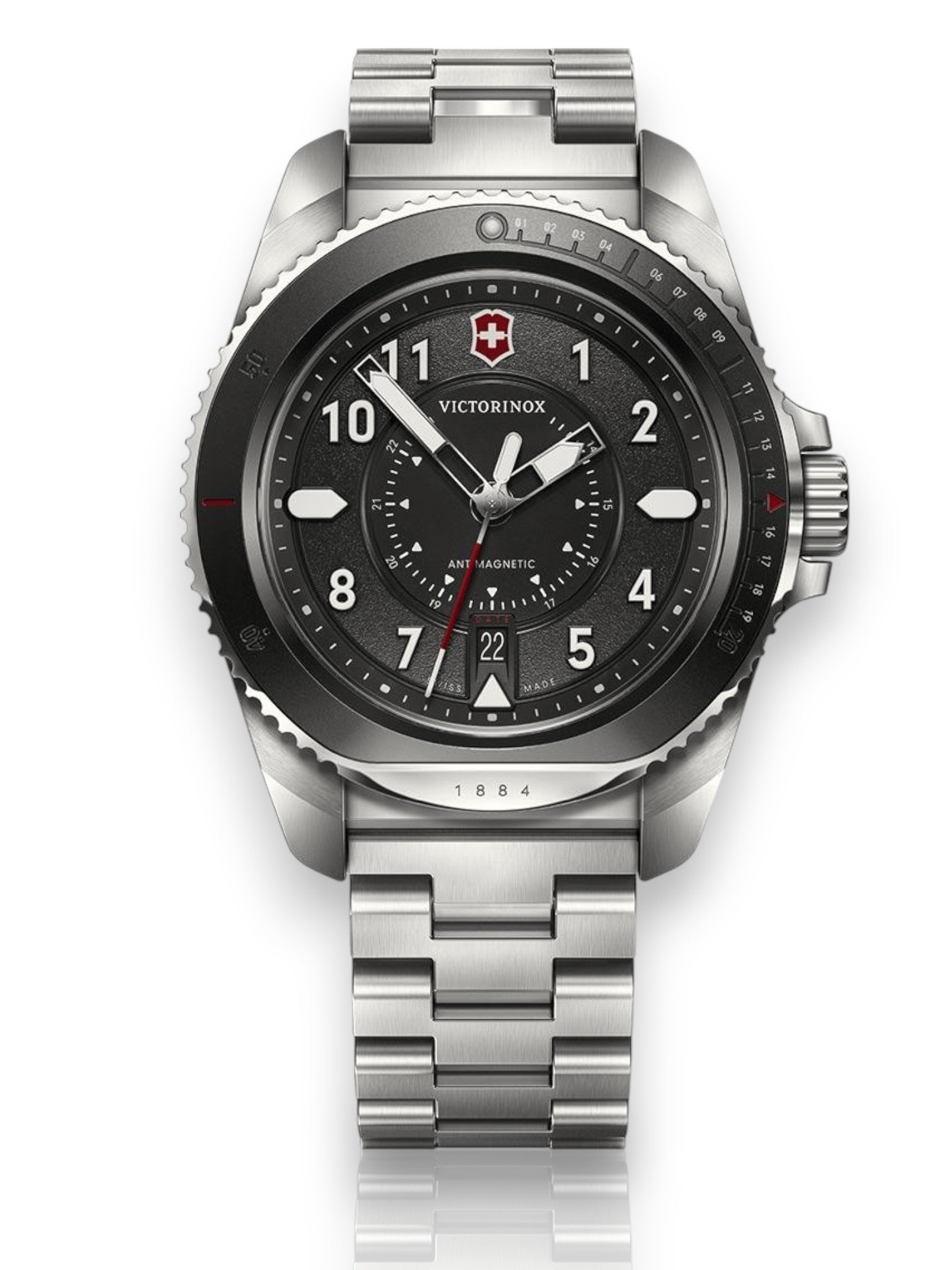 גוף השעון, העשוי פלדת אל-חלד איכותית, מתהדר בגימור מוברש ייחודי המעניק לו מראה יוקרתי ועמיד, ומוסיף נופך של תחכום. בזל מסתובב חד-כיווני בצבע שחור עם סמני דקות בולטים, המעניק לו מראה ייחודי ושימושי, בהשראת שעוני צלילה או שטח. לוח המחוגים השחור והעמוק כולל ספרות ערביות גדולות וברורות יחד עם אינדקסים מודגשים בצבע לבן, כולם מצופים בחומר זרחני לשיפור קריאות בתנאי תאורה חלשים. הלוגו של Victorinox, בצורת הצלב השוויצרי האייקוני, ממוקם מתחת לשעה 12. הכיתוב "ANTI-MAGNETIC" מעיד על עמידותו לשדות מגנטיים, ו"SWISS MADE" בחלק התחתון מדגיש את מקורותיו.